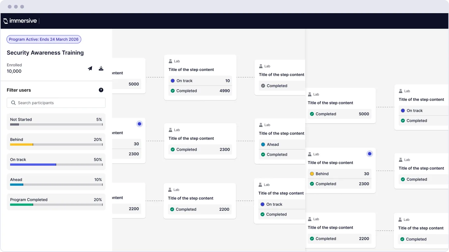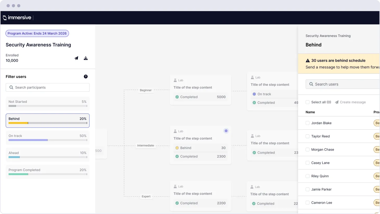Programs combine Immersive One’s adaptive intelligence with a versioned structure of steps. The result is a readiness program that is organized, personalized, and manageable at enterprise scale.