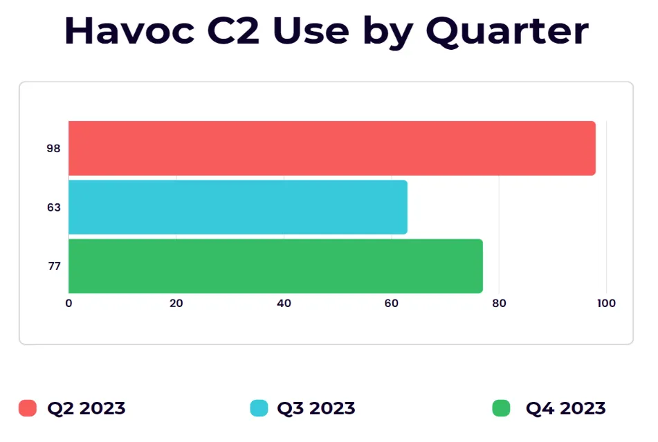 There was a 36% drop in use between Q2 and Q3 2023. This decline may be attributed to the waning novelty of bypassing Defender, as Microsoft consistently updates its security measures to safeguard users against emerging threats. Toward the end of the year, there was a 22% increase in Havoc usage. This trend suggests that with ongoing updates to Havoc and extensive research into other C2 frameworks, Havoc will inevitably be used more by threat actors.This graph was created and informed based on the , , and 2023 threat reports.