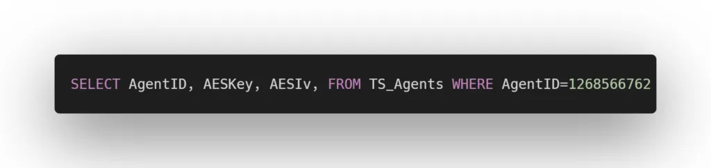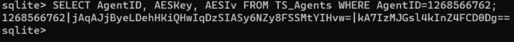 Now that we knew what the keys were, we used this knowledge to develop a methodology for obtaining the keys from packet captures and memory dumps.Another method we found was to obtain the keys from the database using SQLite. This involves running sqlite3 from teamserver.db, and running the query below, replacing the AgentID with the agent ID of your demon.