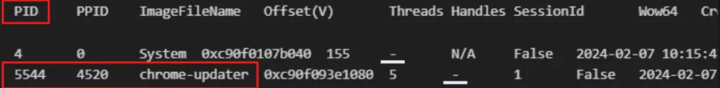 With the process PID in hand, we can then dump the process memory for chrome-updater.exe.