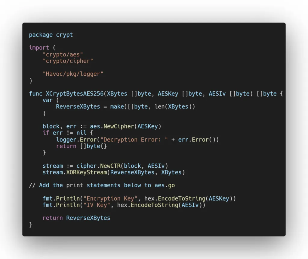 Our research aimed to identify reliable and repeatable ways to obtain encryption keys. Reverse engineering a demon yielded no actionable results. We needed a way to determine what the keys were, so they could be used to decrypt and examine memory and network traffic.To that end, we adopted the same technique we used in our Sliver C2 research. Because Havoc is open source, we identified the source code responsible for generating the encryption keys and added print statements to the code.