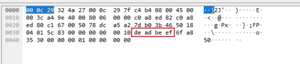 Having obtained the keys, we then developed a methodology to help defensive operators acquire them from both packet capture and memory, detailed below. After setting everything up, we ran the demon on the target machine with Wireshark packet capture enabled. This allowed us to monitor all the HTTP and TCP traffic between the demon and the teamserver.Upon analyzing the first packet in the capture, we noticed that the first bytes said dead beef, which is a magic byte value, shown in the red box in the picture below.