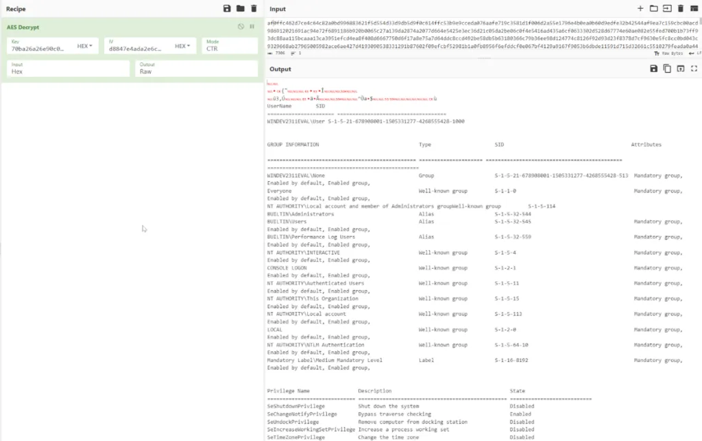 We did this by copying the value and bringing it into CyberChef so we could attempt to use the keys to decrypt it and potentially see a command output. For CyberChef, we needed the encryption method (AES256), the key, IV, and the mode, which we knew was CTR, since the file from Havoc’s GitHub repository indicated as much.