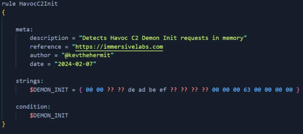 With a reliable method established for obtaining encryption and IV keys from packet capture and memory, a YARA rule was created to specifically detect demon INIT requests in memory.