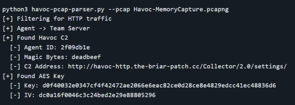 We have also created a Python script to parse Havoc C2 traffic from a packet capture. The requirements for use are in the .The script requires either that the C2 traffic was sent over HTTP or that you can decrypt the TLS layer of the HTTPS traffic using something like TLS MASTER secrets. The Heimdall range is designed to save all these secrets for pcap decryption. If you didn’t have the first packet where the encryption keys are, you could get the keys from memory, as previously discussed, and use them to decrypt the packet capture traffic.An example of the expected output can be found below.