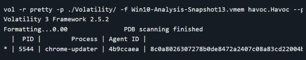 We have also created a Volatility plugin for detecting Havoc C2 in memory, which can be found in our . An example of the expected output is shown in the picture below. This structure isn’t deleted from memory, so rules could be run retroactively to identify Havoc agent actions.