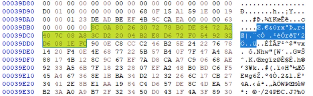 Next, we faced the memory dump for the chrome-updater.exe process. We opened it in a hex editor and began searching for the keys. We wanted to determine if the keys were present in memory and if they could be identified through a scannable, consistent structure.The answer to these questions is yes! We tested this a number of times and came to the same result, as shown in the picture below.