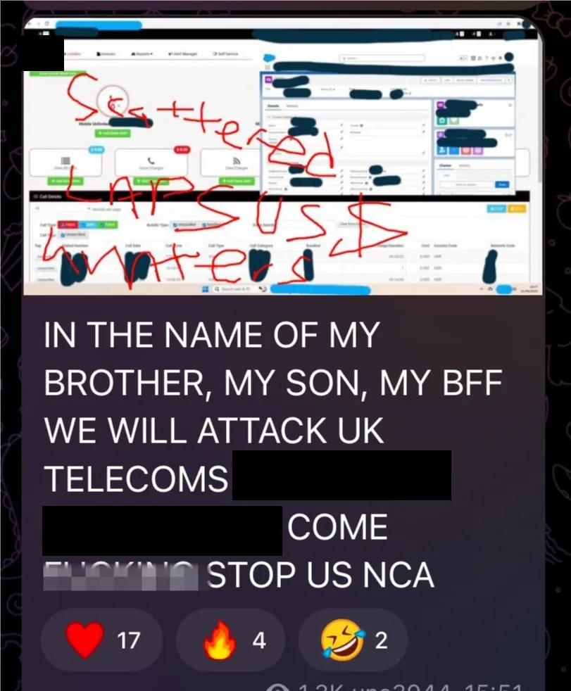 Posts on a Telegram channel potentially owned by the hacking groups discussed their desire to attack a major UK Telco. The channel is no longer live, and there’s a discussion around whether this post is legitimate.